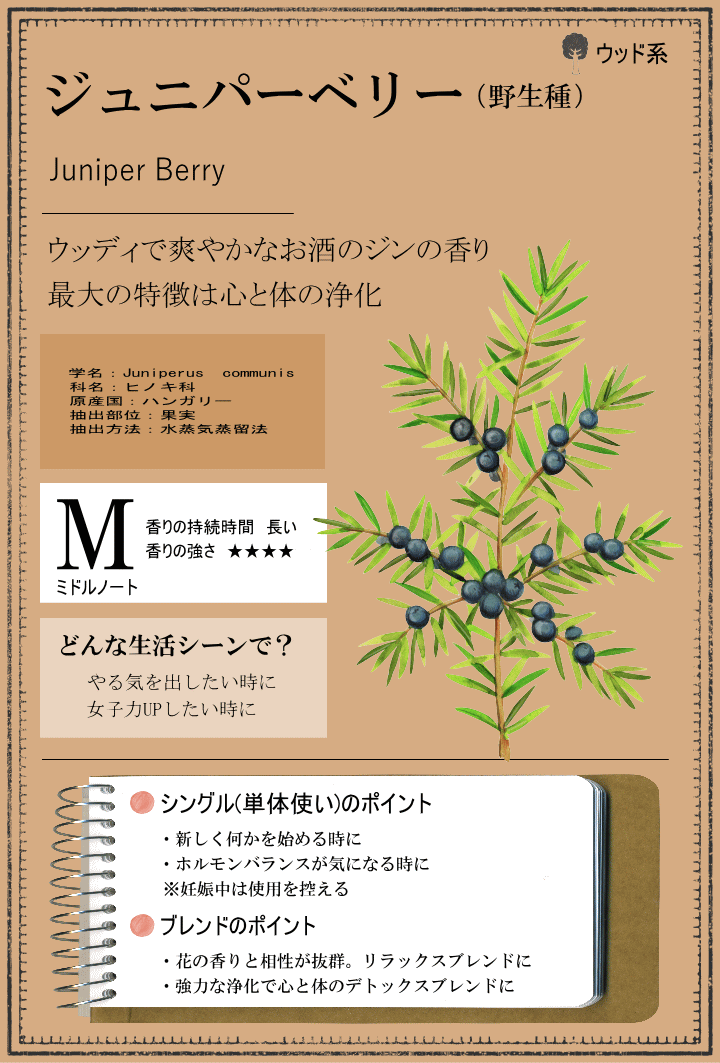 また精油のジュニパーは小枝や果実から採れ、一般的にはジュニパーと呼んでいますが、小枝と果実から作るものをジュニパー、果実のみで作るものをジュニパーベリーと分けて呼ぶこともあります。